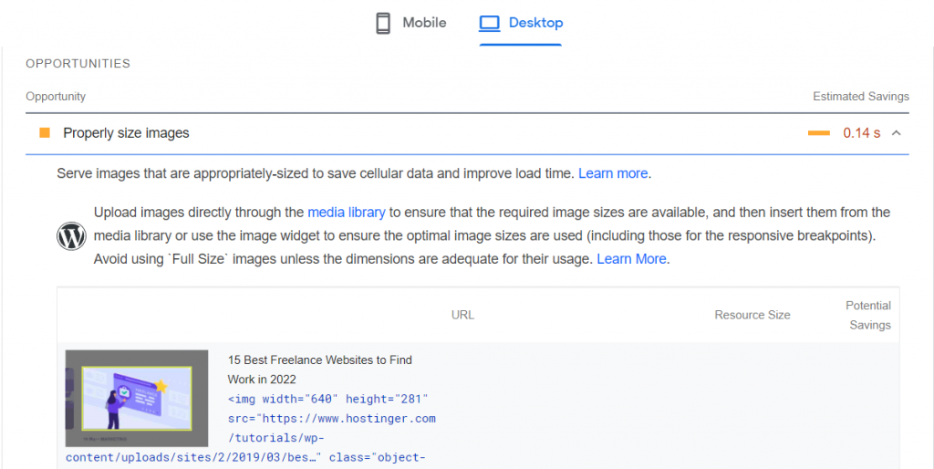 Par exemple, si l’outil détecte une image de grande taille, il suggérera de la télécharger via la bibliothèque multimédia pour éviter d’utiliser des photos en taille réelle. Le tableau ci-dessous présente les photos qui peuvent être optimisées et les économies potentielles qu’elles permettent de réaliser.