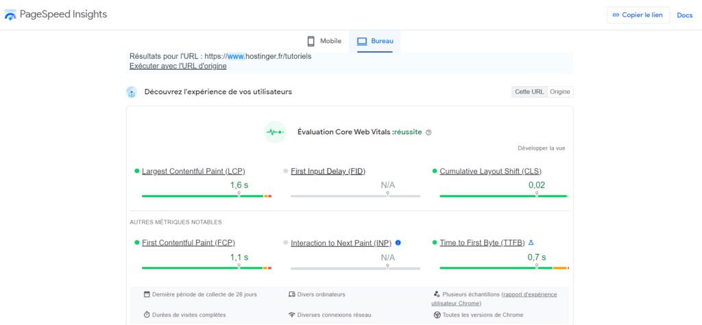 Cette section vous guidera à travers un test Core Web Vitals à partir de la page Hostinger Tutoriels en utilisant PageSpeed Insights.