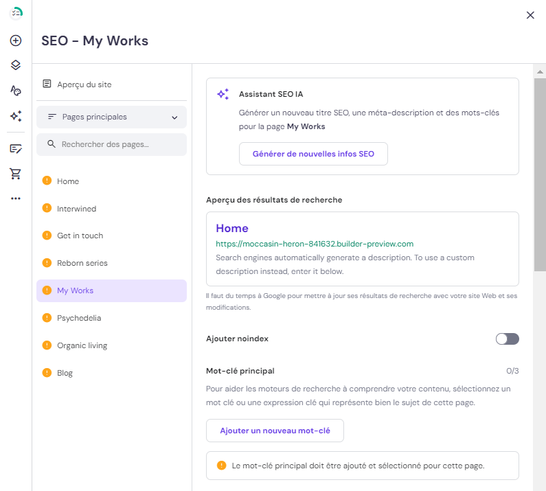 Pour accéder aux outils de référencement, allez sur la page des paramètres du site web et cliquez sur Paramètres de référencement. Vous verrez alors apparaître l’indicateur de référencement de vos pages de portfolio.