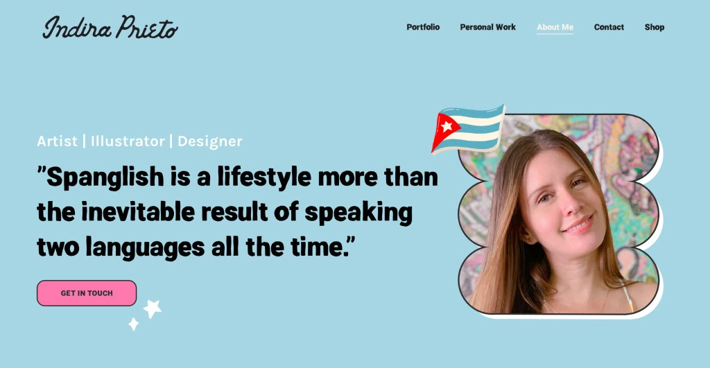 Pour vous inspirer, regardez comment Indira Prieto a structuré son site de portfolio, The Indy Sign. En utilisant le Créateur de Sites Web d’Hostinger, elle a combiné les capacités du constructeur avec son image de marque unique pour créer son portfolio d’art digital.