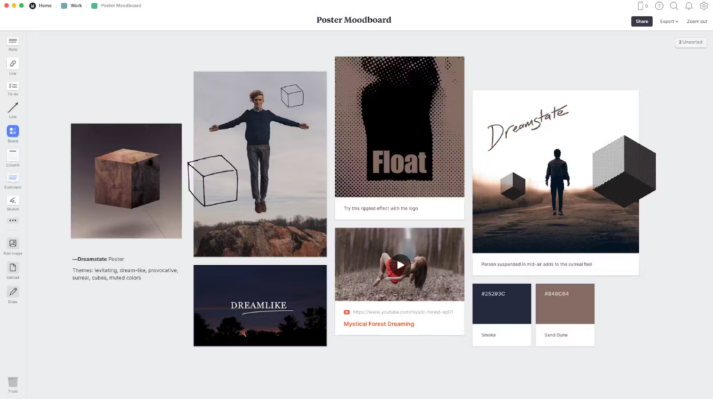 Milanote est un excellent outil pour créer des planches de tendances. Son interface flexible de type « glisser-déposer » permet aux utilisateurs de disposer divers éléments de la manière qu’ils préfèrent, y compris des images, des lignes, des liens et des notes.