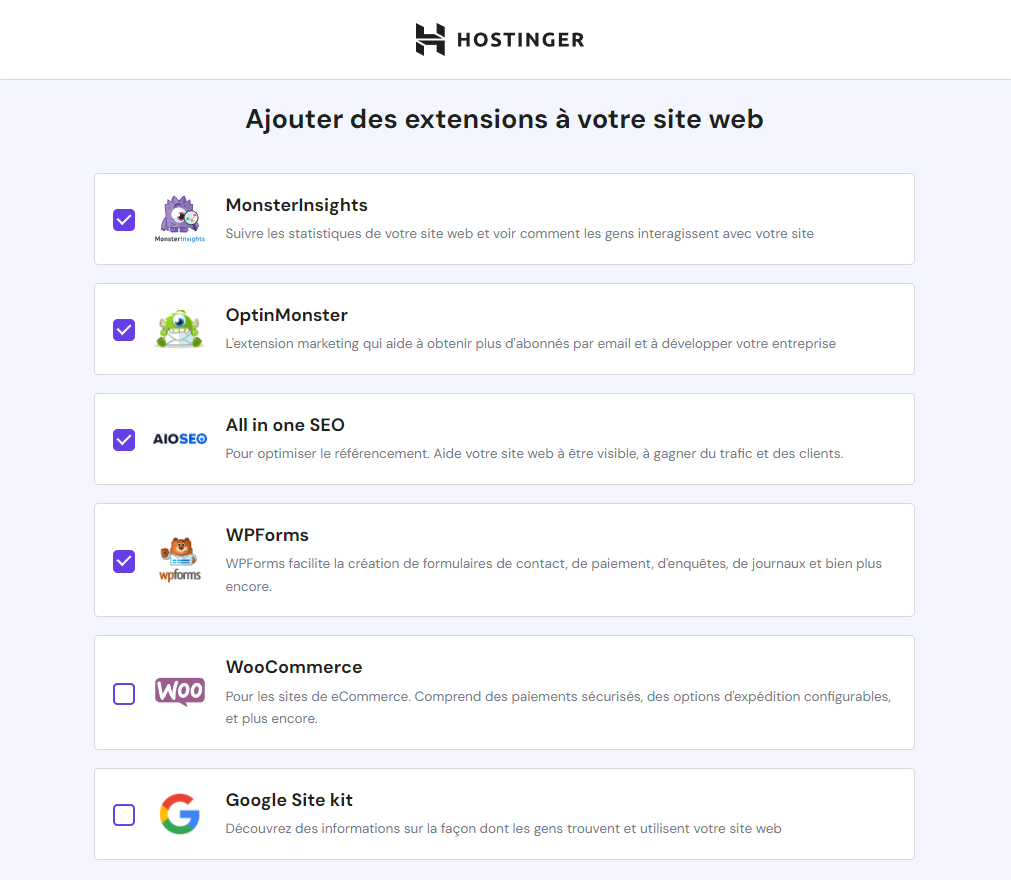 5. Dans cette étape, vous pouvez choisir des extensions à ajouter à votre site WordPress.