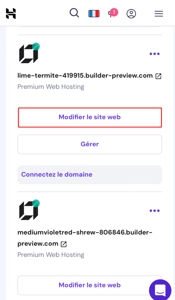 1. Sélectionnez le site Web sur lequel vous souhaitez travailler. Pour modifier un site Web créé avec le Créateur de Sites Internet d’Hostinger, cliquez sur Modifier le site Web sous son nom de domaine.