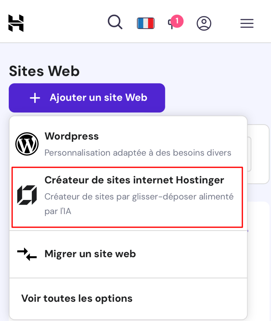 Connectez-vous à hPanel, sélectionnez le site Web que vous souhaitez modifier ou choisissez d’en créer un nouveau avec le Créateur de Sites Internet d’Hostinger. Vous pouvez modifier votre site web directement à partir du navigateur sur différents appareils mobiles.