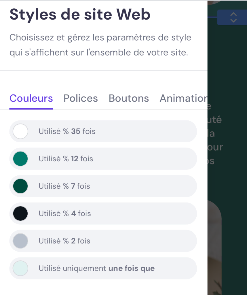 Dans l’onglet Couleurs, vous pouvez voir combien de fois différentes couleurs ont été utilisées dans votre conception Web globale. Le menu Styles du site web vous permet également de modifier la typographie du titre et du corps du texte et de définir un style d’animation principal pour les boutons et les éléments. Vous pouvez ainsi vous assurer que le site reflète fidèlement votre marque.