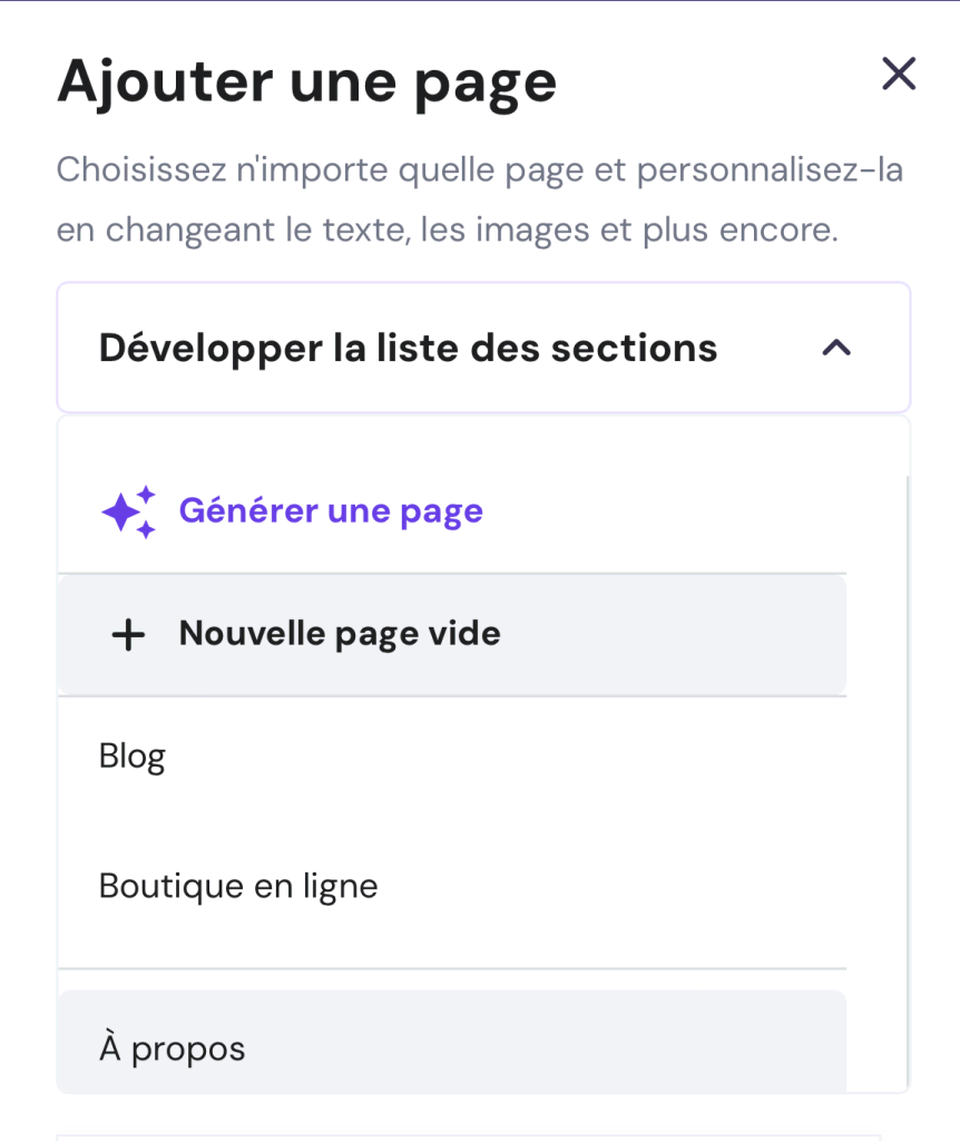 1. Ajoutez de nouvelles pages à votre site en appuyant sur le bouton Ajouter une page. Vous pouvez choisir parmi les templates de page existants ou créer une nouvelle page vide.