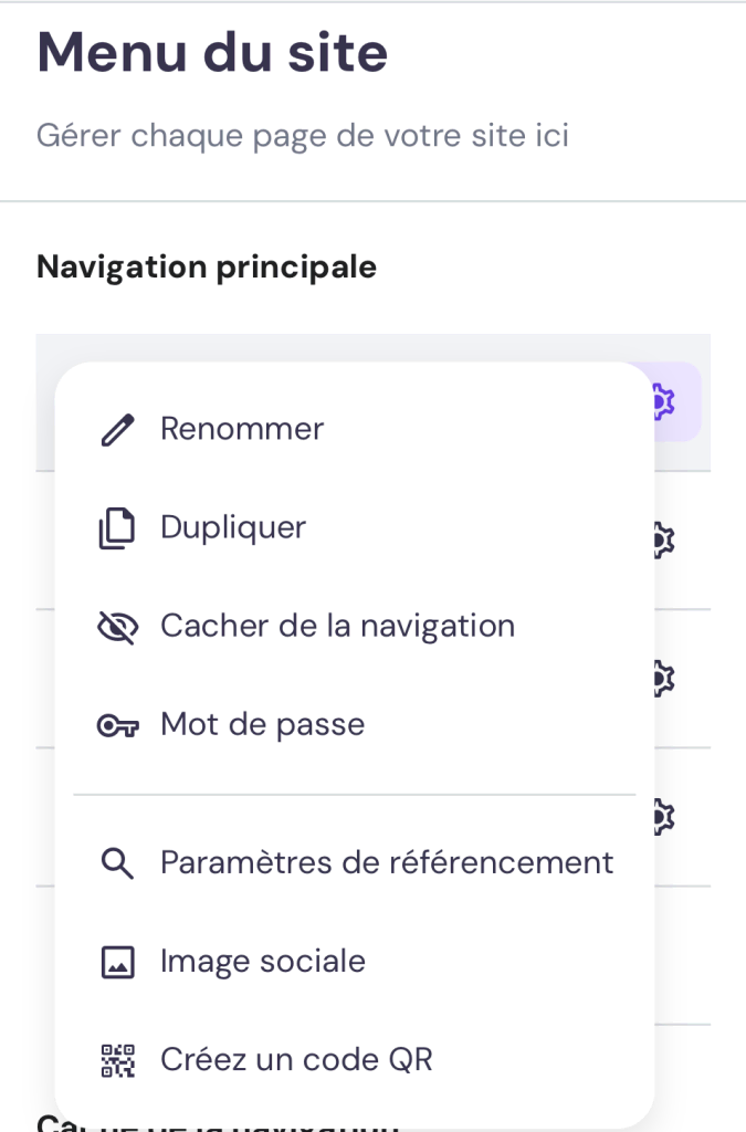1. Gérez les paramètres, tels que les métadonnées SEO et les URL des pages, en cliquant sur l’icône en forme de roue dentée. Vous pouvez également ajouter des mots de passe pour restreindre l’accès aux pages.