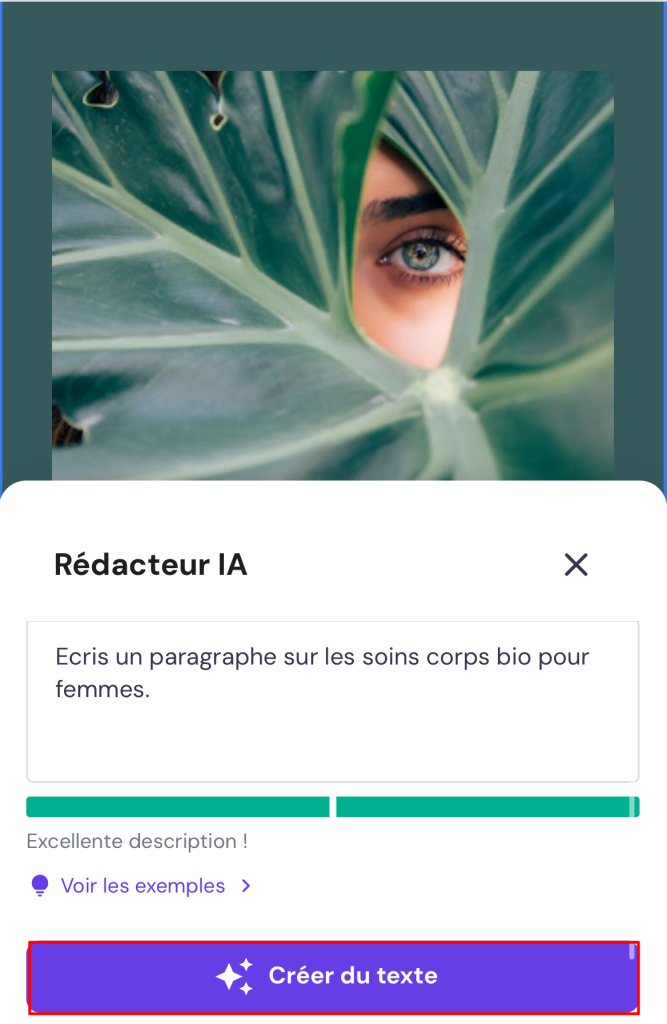 Appuyez ensuite sur l’icône IA, décrivez votre contenu et générez le texte. Notez que votre description doit comporter au moins 10 caractères. Soyez donc aussi détaillé que possible pour obtenir les meilleurs résultats.
