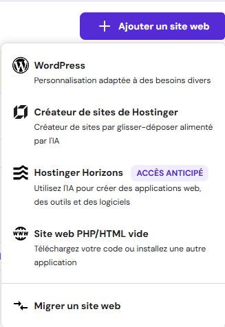Après avoir effectué votre paiement, rendez-vous sur le tableau de bord hPanel et sélectionnez Sites Web → Liste des sites dans la barre latérale gauche. Ensuite, cliquez sur Ajouter un site web et choisissez Hostinger Horizons.