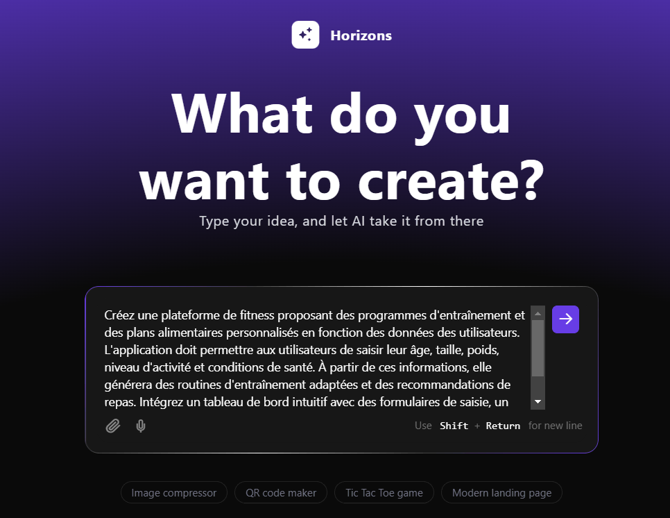 Vous verrez un champ de texte dans lequel vous pourrez écrire votre message dans plus de 80 langues. Après avoir décrit votre application web, appuyez sur Entrée.