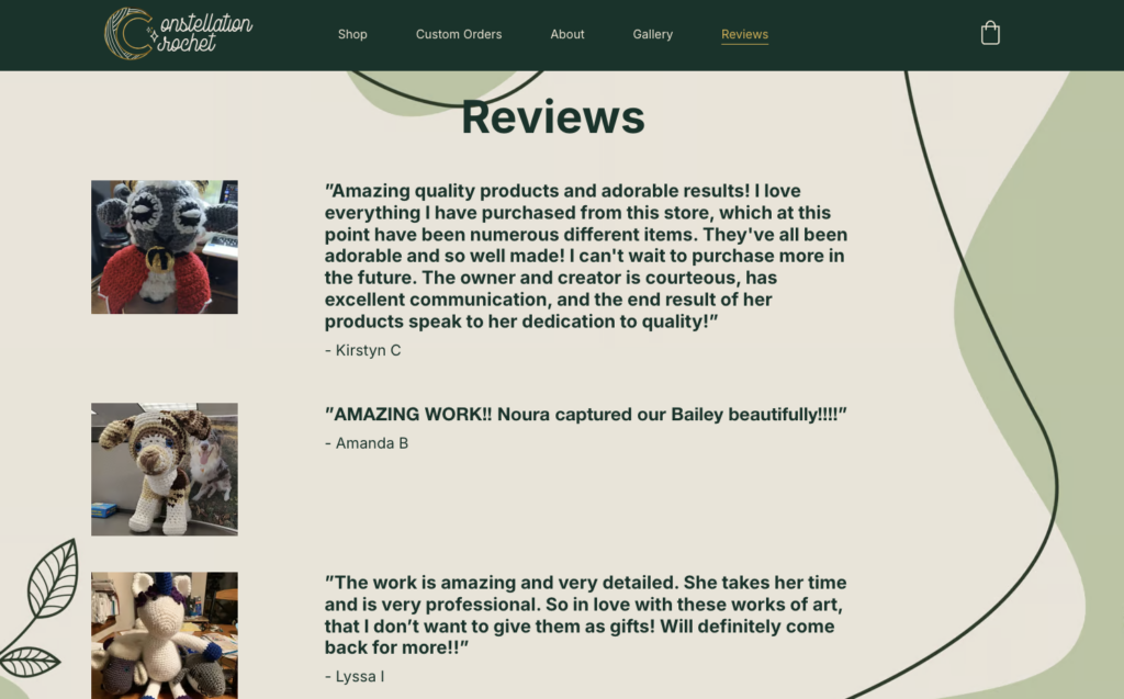 L’instauration d’une relation de confiance avec les clients est un élément essentiel de votre stratégie de marketing. Par exemple, Constellation Crochet utilise les commentaires de ses clients sur son site web pour rassurer les nouveaux acheteurs sur la qualité de son travail :