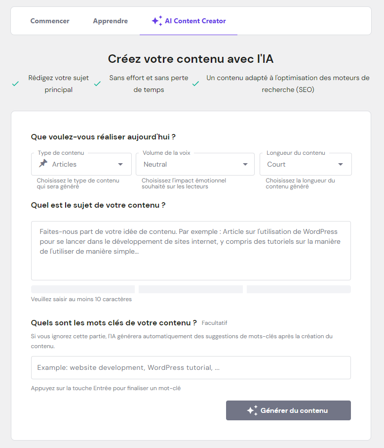 Hostinger AI est une extension WordPress qui accélère la création de contenu pour les articles de blog. Pour l’utiliser, entrez un sujet et des détails spécifiques tels que la longueur du contenu et les mots-clés importants. C’est tout – l’IA génère un article de blog unique et optimisé pour le référencement. De plus, notre assistant IA sélectionnera une image stock appropriée pour l’image vedette de l’article.