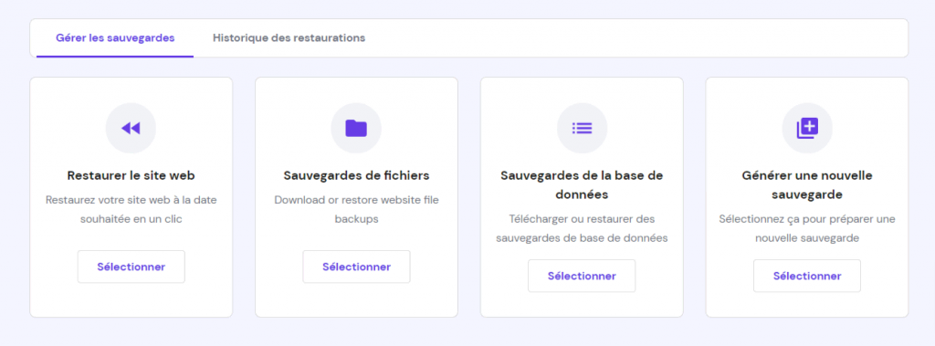 3. Cliquez sur le bouton Sauvegarde de fichiers, puis Sélectionnez les données de sauvegarde. Si vous souhaitez restaurer l’intégralité du site, choisissez le dossier public_html et cliquez sur Restaurer les fichiers.