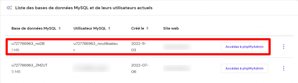 - Faites défiler vers le bas jusqu’à votre nouvelle base de données et cliquez sur Accéder à phpMyAdmin.