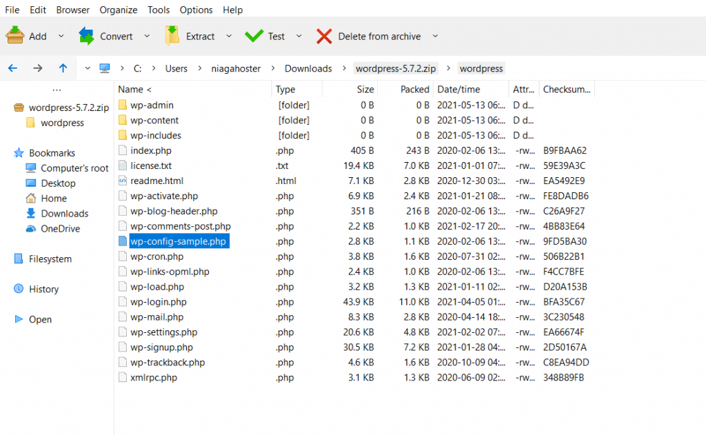 - Dans le dossier extrait, supprimez le dossier wp-content et le fichier wp-config-sample.php.