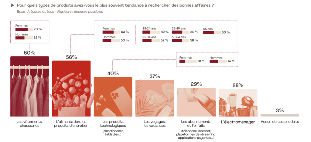 Loin derrière ce trio de tête, les voyages et vacances (37%), les abonnements et forfaits divers (29%) ou encore les appareils électroménagers (28%) complètent la liste des catégories les plus prisées par les Françaises et les Français en quête de bonnes affaires.
