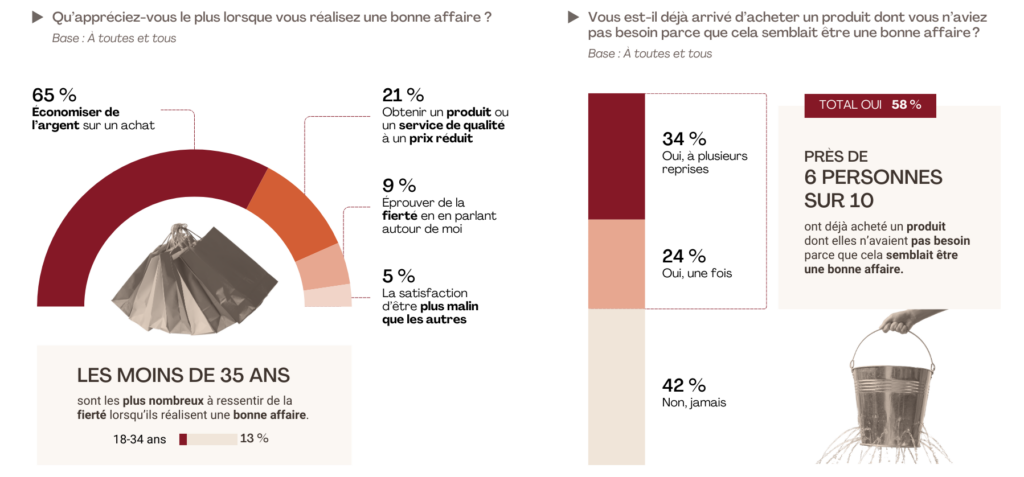Ainsi, plus d’1 personne sur 5 (21%) souligne la possibilité d’accéder à moindre coût à des produits ou services de qualité supérieure, tandis que 9% des répondants – proportion qui grimpe à 13% chez les 18-34 ans -, évoquent la fierté de partager leurs trouvailles avec leur entourage. Par ailleurs, 5% des personnes interrogées reconnaissent se sentir plus malins que les autres lorsqu’ils réalisent une bonne affaire.