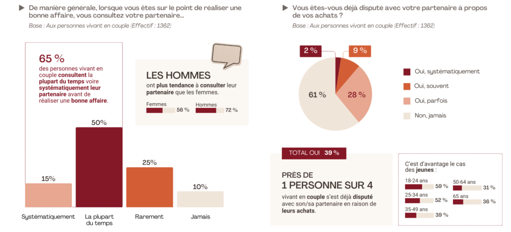 Dans la sphère conjugale, il apparaît que la prise de décision autour d’un achat avantageux repose le plus souvent sur une forme de concertation. En effet, près des deux tiers (65%) des personnes en couple déclarent en discuter avec leur conjoint(e), que ce soit de manière systématique (15%) ou dans la plupart des cas (50%).