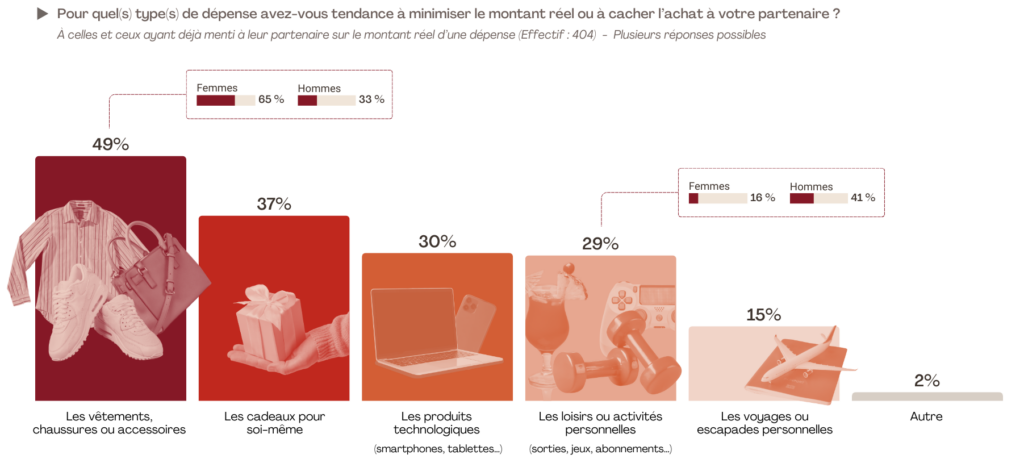 Une distinction particulièrement nette apparaît selon le genre : les femmes dissimulent principalement des achats vestimentaires (65% contre 33% des hommes), tandis que la gent masculine est clairement plus encline à minimiser ses dépenses en loisirs et activités personnelles (41% contre 16% des femmes).