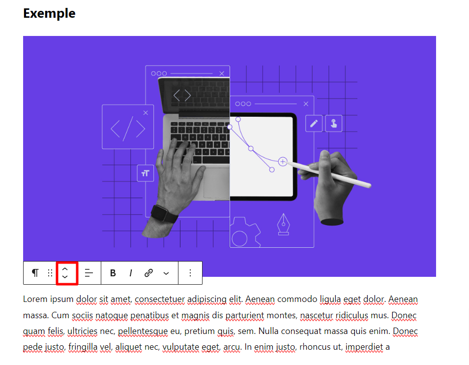 Gutenberg propose deux façons de réorganiser les blocs en vous vous servant de la barre d’outils flottante. À l’aide de l’icône à six points, vous pouvez sélectionner plusieurs blocs et les faire glisser et les déposer n’importe où.