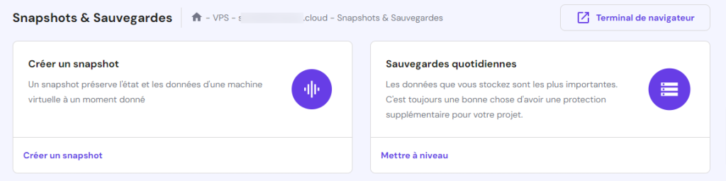 Ces fonctionnalités sont accessibles sous Sauvegarde et surveillance → Snapshots et Sauvegardes dans le tableau de bord de votre VPS.