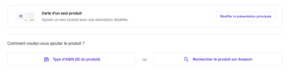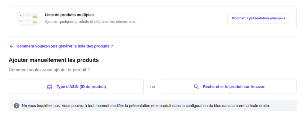 Pour ajouter manuellement vos produits d’affiliation à la liste, vous pouvez fournir leur numéro ASIN ou en chercher un sur Amazon.