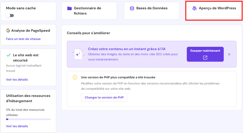 Si vous avez déjà un site web sur lequel vous souhaitez activer le plugin, vous pouvez le faire via hPanel :