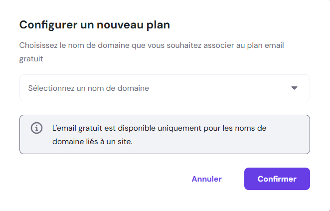 - Choisissez le nom de domaine pour lequel vous voulez créer un compte e-mail et cliquez sur Confirmer.