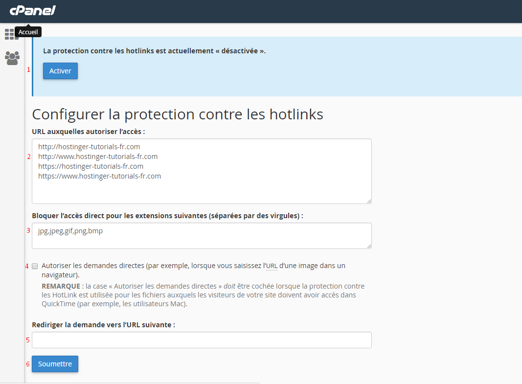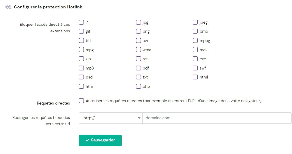 - Dans le champ Rediriger les requêtes bloquées vers cette url, vous avez la possibilité de saisir l’URL d’une page d’erreur que vous souhaitez montrer aux visiteurs qui tentent de créer un hotlink sur votre site web.
