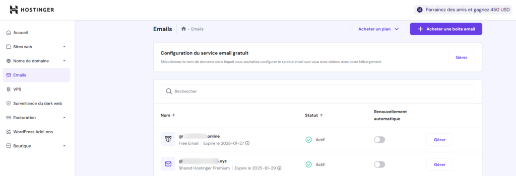 Sur hPanel, vous pouvez configurer et gérer votre compte e-mail dans la section Emails. Tous vos plans de messagerie et boîtes email sont répertoriés sous les noms de domaine correspondants. Vous pouvez y consulter l’état de chaque plan, activer le renouvellement automatique et ouvrir les paramètres individuels de chaque boîte email.