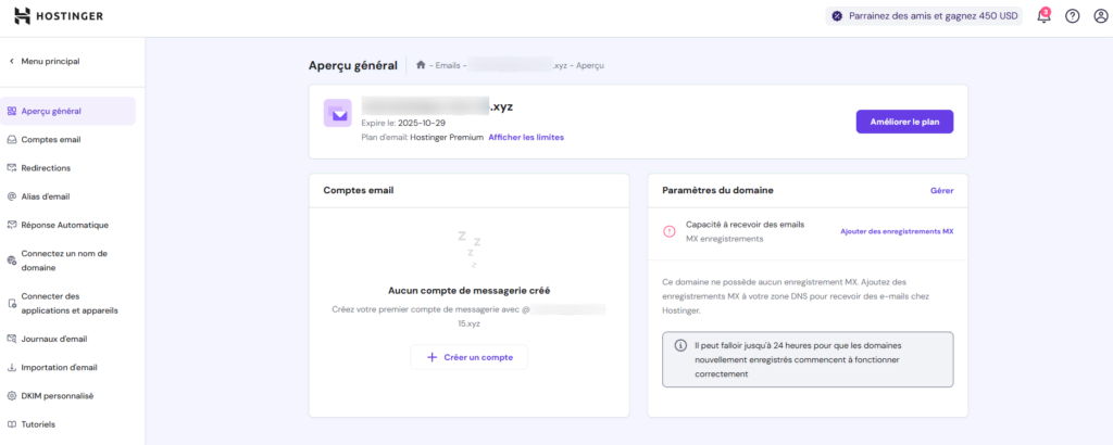 Utilisez hPanel pour gérer les différents aspects de votre nom de domaine :