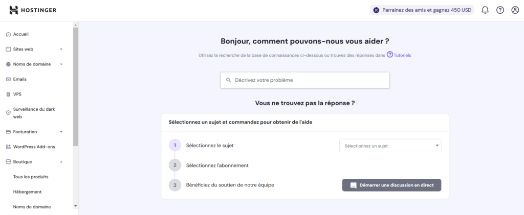 La section Aide de hPanel contient diverses ressources pour dépanner et optimiser votre expérience d’hébergement. Cela inclut une base de connaissances avec des guides détaillés et des tutoriels sur différents sujets. De plus, vous pouvez contacter notre équipe succès client 24/7 pour obtenir de l’aide.