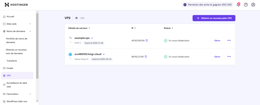 Dans la section VPS, visualisez et gérez vos plans VPS. Obtenez un aperçu général des détails du serveur, de l’accès SSH et de l’état général de vos serveurs. Cliquez sur Obtenir un nouveau plan VPS pour acheter de nouveaux plans.