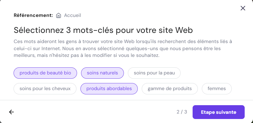 Grâce à notre fonction SEO sur le Créateur de Sites Internet d’Hostinger, vous pouvez générer sans effort des mots-clés de référencement très performants.