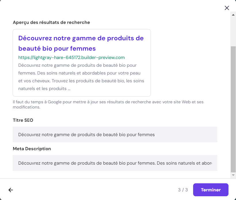 Il vous suffit de fournir des informations sur votre marque et votre site pour que l’IA génère des mots-clés SEO, des titres de page, des méta-descriptions et des en-têtes efficaces.