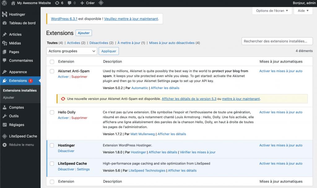 Vous pouvez également lancer des mises à jour pour les plugins et les thèmes. Toutefois, vous pouvez activer les mises à jour automatiques si vous ne souhaitez pas mettre à jour manuellement chaque plugin de votre site web. Pour ce faire, rendez-vous sur votre page Plugins. Sélectionnez ensuite l’option Activer les mises à jour automatiques sur le côté droit de chaque plugin.