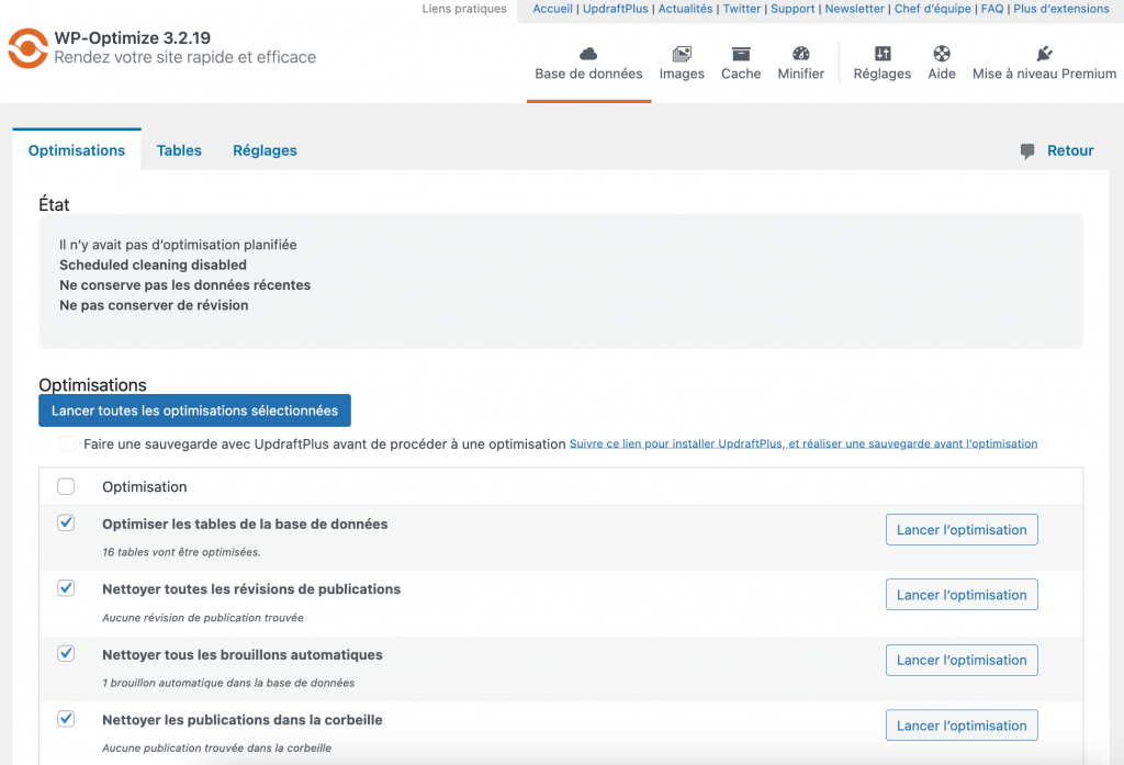 - Supprimez les fonctionnalités inutiles de la base de données avec WP-Optimize.