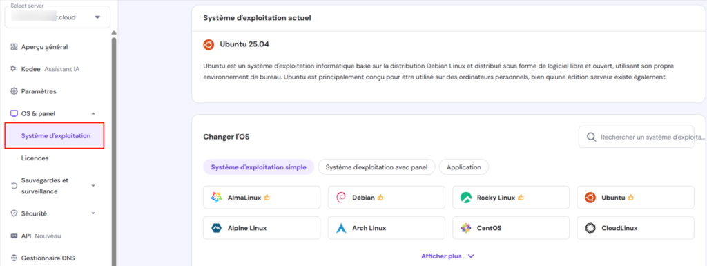C’est ici que vous trouverez les systèmes d’exploitation et leurs templates disponibles pour votre serveur VPS.