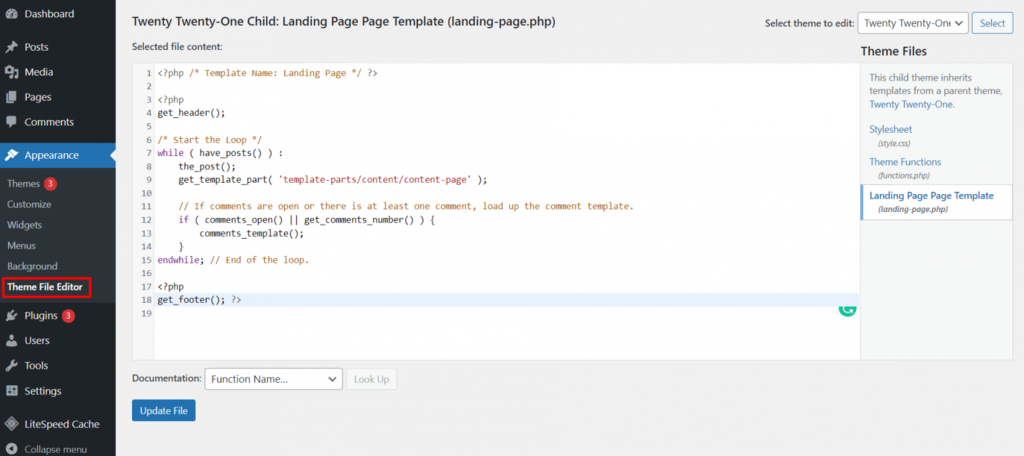 L'éditeur de fichiers du thème qui vous permet de modifier le code de votre thème enfant, y compris les fonctions du thème et les pages personnalisées.