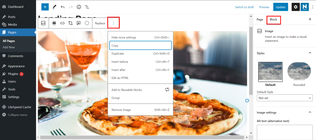 Une fois le bloc ajouté, vous pouvez le modifier dans l’onglet Bloc de la barre latérale ou en cliquant sur les trois points verticaux situés au-dessus de lui.