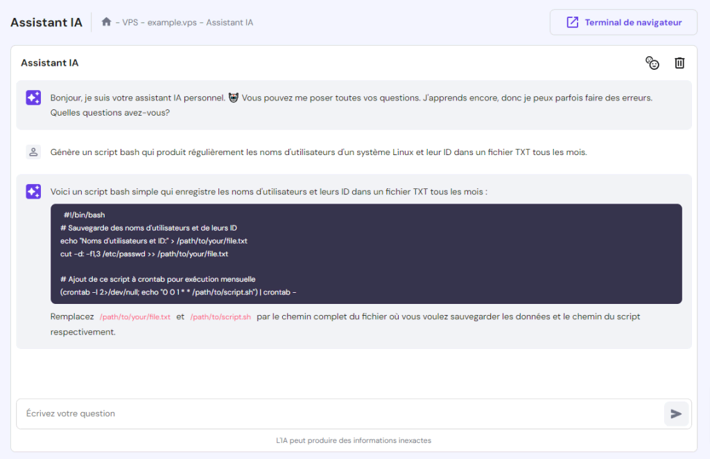 Chez Hostinger, vous pouvez l’installer facilement à l’aide d’un template de tableau de contrôle via hPanel. Nous proposons également Kodee, un assistant VPS IA qui aide à générer des scripts bash pour automatiser les tâches répétitives d’administration des utilisateurs.