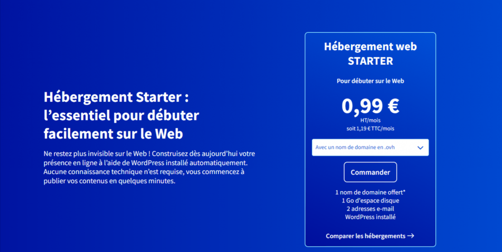 | OVH | 0,99 €/mois | 100 | ✅ | ✅ | Quotidiennes | Non spécifié | ✅ |