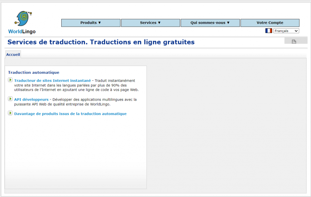 WorldLingo est un outil de traduction en ligne qui offre des traductions de texte et de site web dans plus de 100 langues. Il dispose également d’un ensemble d’outils linguistiques, notamment des dictionnaires, des grammaires et des ressources pour l’apprentissage des langues.