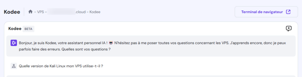 Il vous suffit de demander à Kodee « Quelle version de Kali Linux mon VPS utilise-t-il ? » et il vous indiquera la version du système d’exploitation actuellement installée.