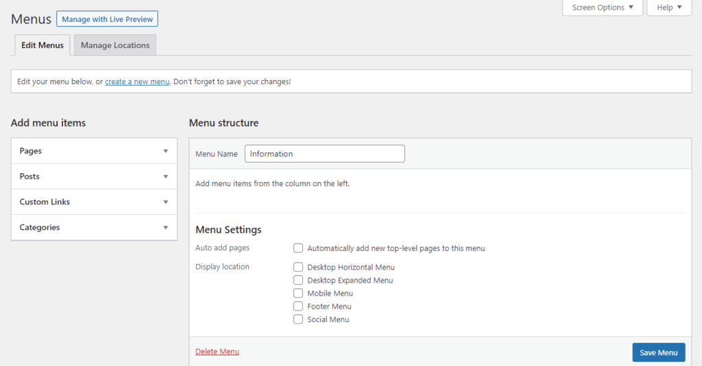 - Saisissez un nouveau nom de menu et cliquez sur le bouton Enregistrer le menu.