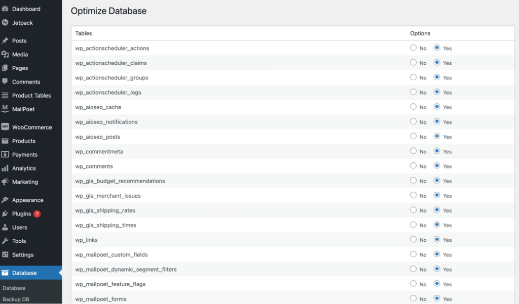 Choisissez Oui pour toutes les tables de base de données que vous souhaitez optimiser. Ensuite, faites défiler vers le bas de l’écran et sélectionnez Optimize.