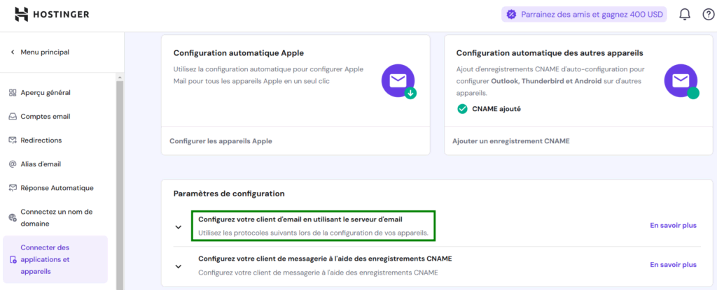 - Choisissez Connecter des applications et appareils dans la barre latérale, puis Configurez votre client d’email en utilisant le serveur d’email.