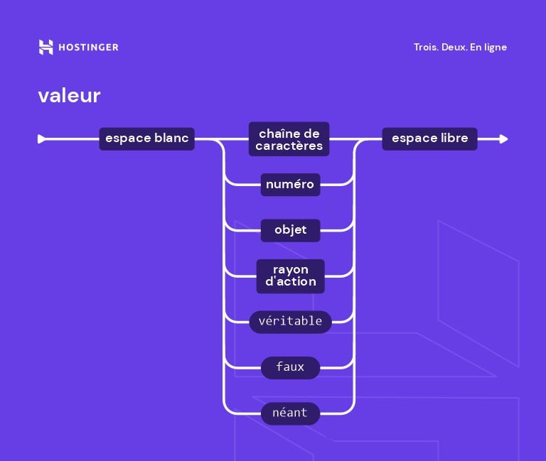 - Les valeurs sont des types de données JSON valides. Elles peuvent se présenter sous la forme d’un tableau, d’un objet, d’une chaîne de caractères, d’un booléen, d’un nombre ou de null.