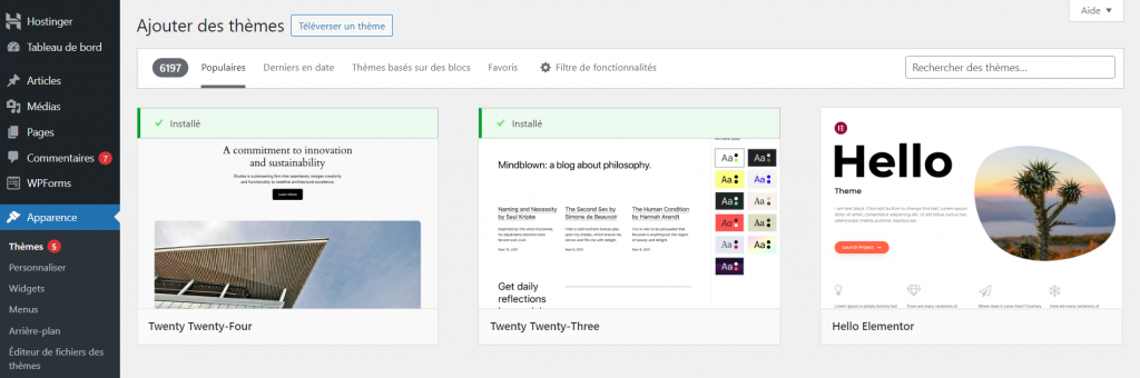Les utilisateurs peuvent installer des thèmes WordPress à partir du répertoire officiel directement depuis leur tableau de bord en naviguant vers Apparence → Thèmes → Ajouter. Pour les thèmes premium, téléchargez les fichiers ZIP manuellement.