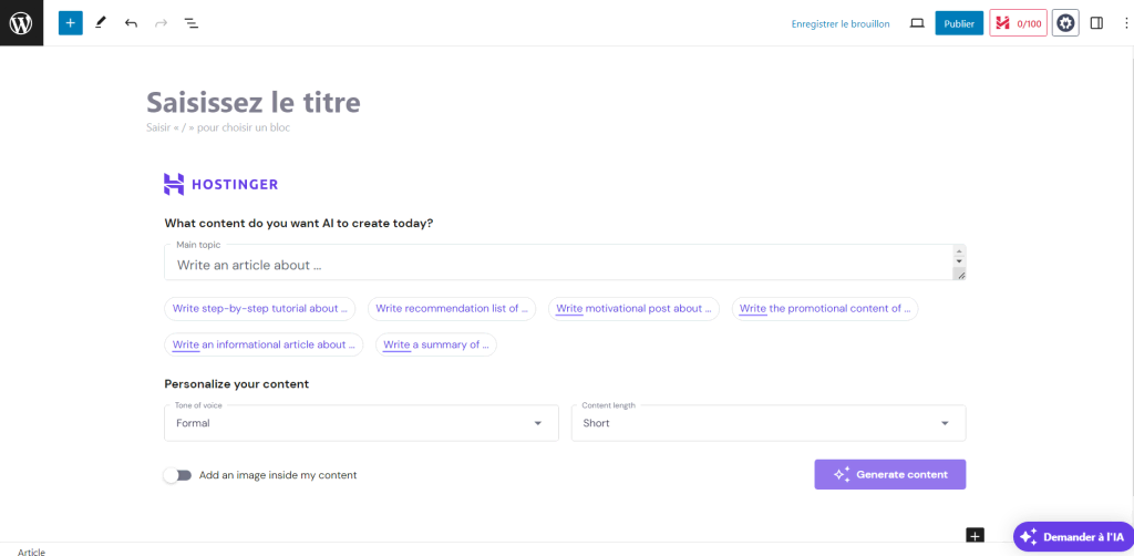 L’assistant d’intelligence artificielle (IA), disponible avec l’extension Hostinger IA, vous aide à générer des idées et à rédiger du contenu attractif qui augmente le trafic sur votre site web.